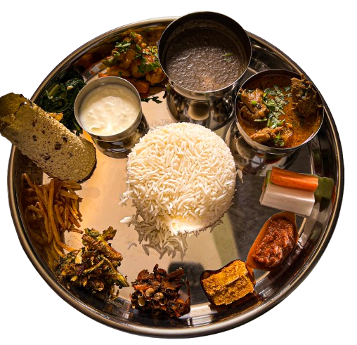 A hearty, authentic Nepali dinner consisting of rice, lentils, seasonal vegetables, pickles, and flavorful curries-a bit of home in every bite.